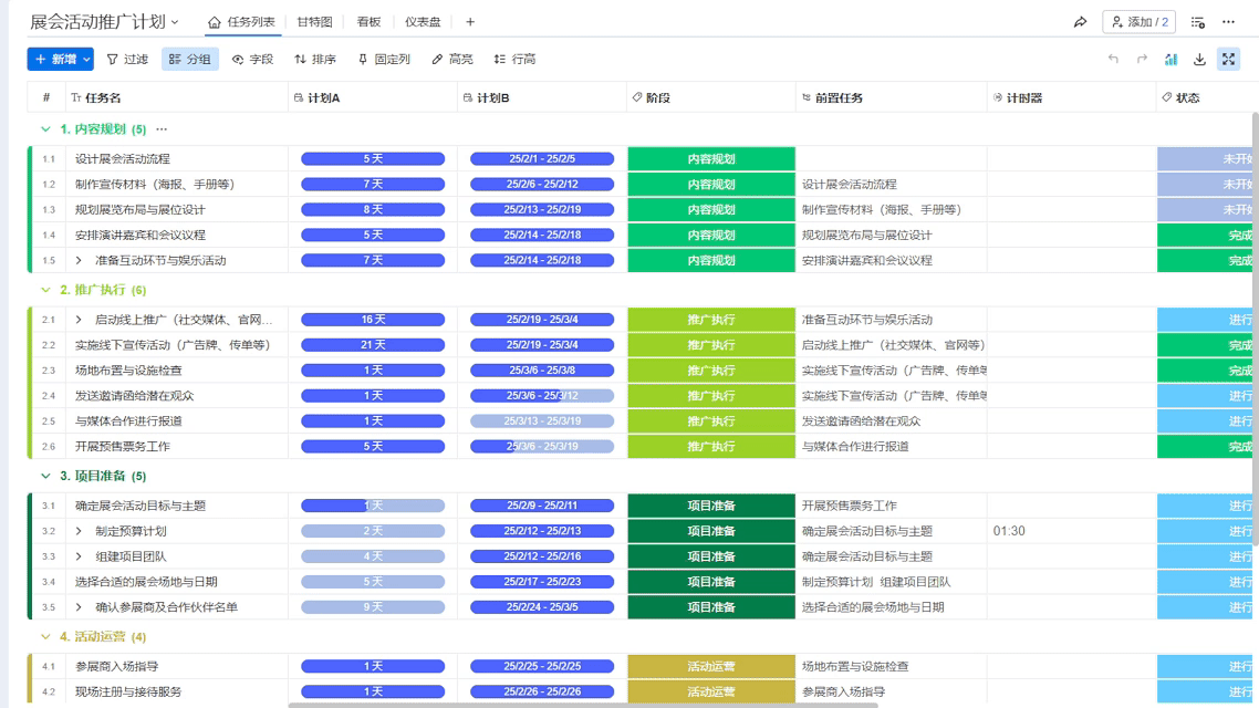 基础功能自定义视图本页总览自定义视图 在项目标题下方,可以看到当前视图可配置的状态,允许根据个人需求或工作场景,灵活地调整视图的展示方式,以便更有效地管理和分析数据。 这些状态包括但不限于: 搜索 多维数据分组 字段显示隐藏 排序 固定列 行高亮 行高 搜索